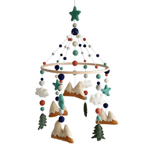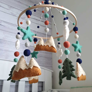 With copper and cream mountains, moss green trees, persian stars and felt balls and shapes in white, cream, cinnamon, persian, natural and navy.