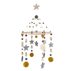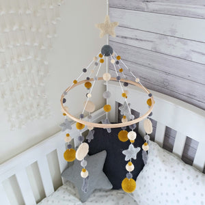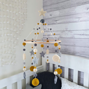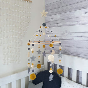 Popular mustard and cream have been paired with two shades of grey in this NZ designed contemporary baby mobile.