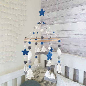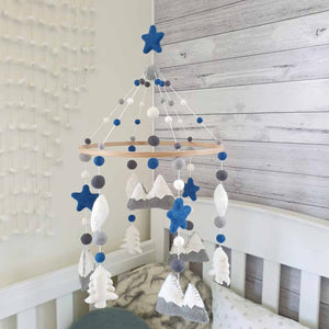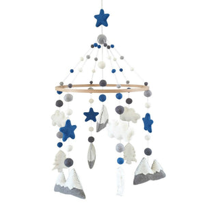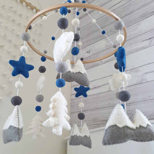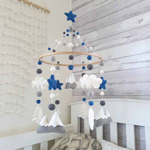 The mobile colours are white, dove grey, mid grey and steel blue. The mountains are 10cm wide and 7cm high, clouds are 8cm wide by 5cm high and the trees are 5cm wide and 7cm high.