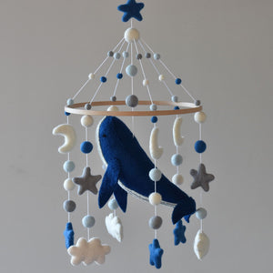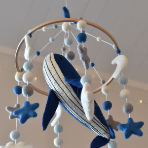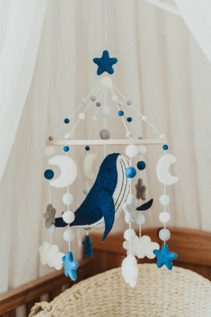 Our beautiful whale is having adventures at night, playing amongst the stars, the moons and the clouds.
