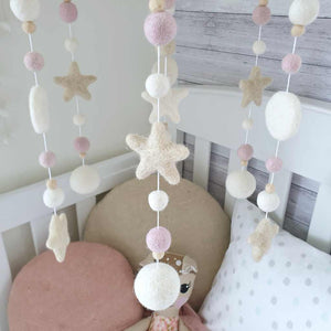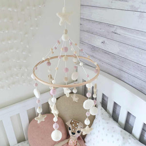Our Blushing Baby nursery mobile in soft and dreamy colours of white, cream and baby pink.