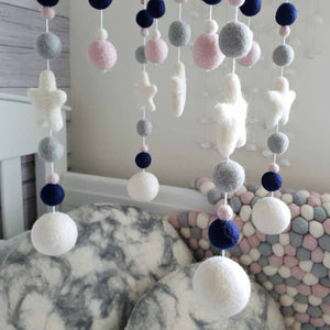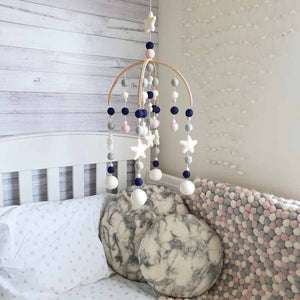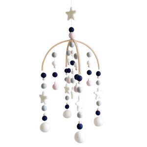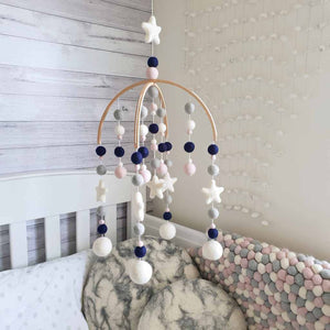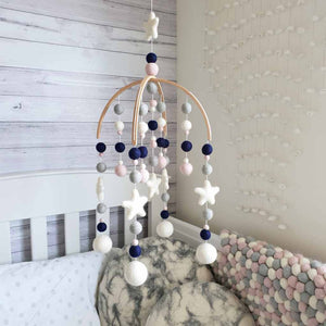 A beautiful cot mobile in modern yet timeless nursery colours.