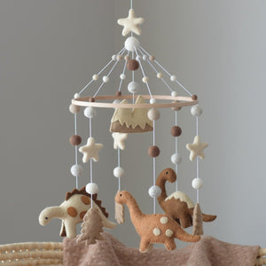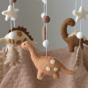 Neutral dinosaur baby mobile in shades of brown with white and cream.