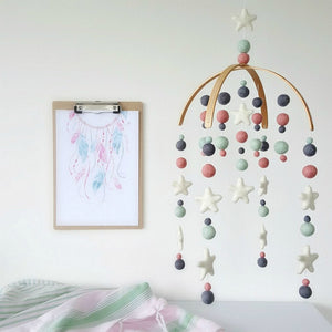 This gorgeous baby girl mobile features white, dusky pink, mint and mid grey felt balls. Each hand rolled felt ball has been placed to create a visually captivating mobile whilst the contrasting colours engage and stimulate baby.