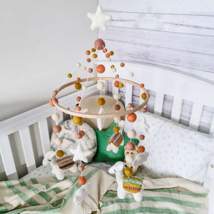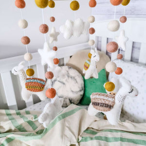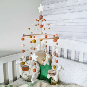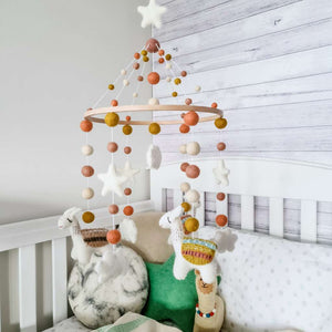 With a striking earthy palette, inspired by the colours of the desert this is another of our adorable llama themed baby cot mobiles.
