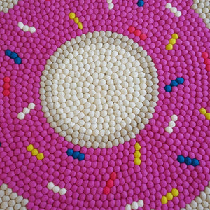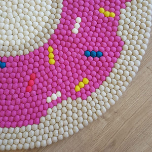 Fun donut design in bright colours! Thousands of felt balls are meticulously stitched together to create a unique, one-of-a-kind rug. And they are so incredibly soft underfoot.