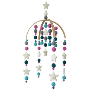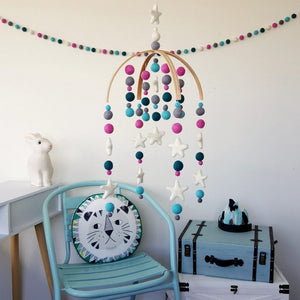 A pretty palette in white, mid grey, emerald, aqua and amaranth pink along with white stars and all hand made with 100% wool felt.