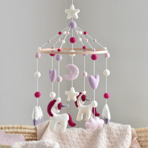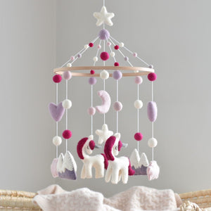 Pretty unicorn design with lavender mountains and hearts, a crescent moon and baby pink clouds.