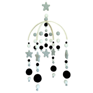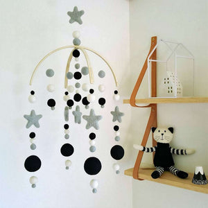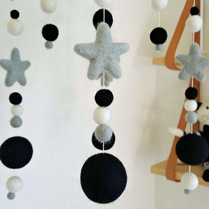 With black, dove grey and white felt balls and dove grey stars this mobile will captivate your little one, soothing and calming as it lulls baby to sleep.
