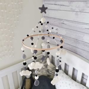 Just like all of our mobiles, this is made using 100% wool felt, clouds are filled with polyfibre fill.