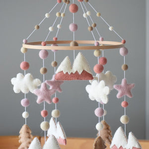 Dusky pink and white mountains, camel coloured trees, baby pink stars and felt balls in complimentary colours.