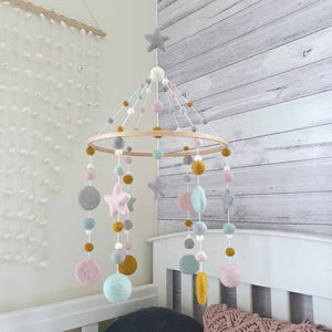 One of Tik Tak Design Co.'s designer baby mobiles in a beautiful and modern mix of nursery colours - white, mustard, dove grey, mint and baby pink.