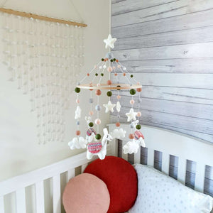 The felt ball colours in this mobile are white, dove grey, moss, rose pink and caramel.