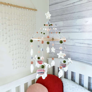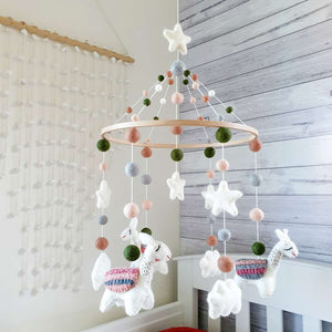 Warm colours of caramel, rose pink and moss green come together to create a boho inspired design for this Llama baby mobile.