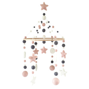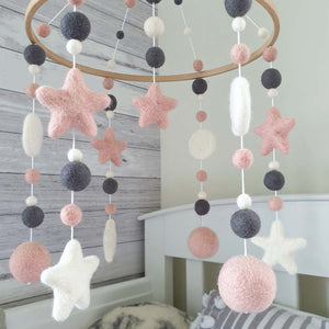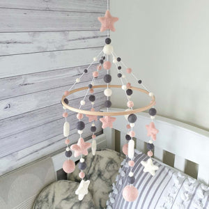 Pretty in pink and teamed with grey and white, this contemporary baby mobile will help add the finishing touch to your nursery decor.