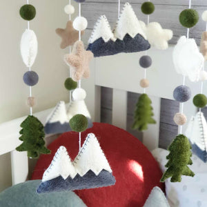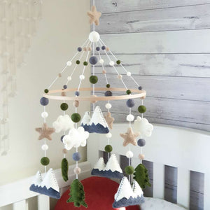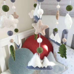 The mountains are calling! Dreamy woodland nursery baby mobile wood scene in complimentary colours.
