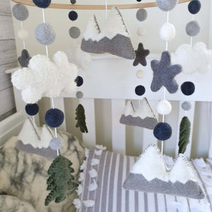 Beautifully handcrafted mountain woodland scene in muted greys and green to enchant your little one and add that finishing touch to your nursery.
