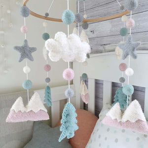 Made with baby pink and white mountains, mint trees, dove grey stars and felt balls in white, dove grey, mint and baby pink.