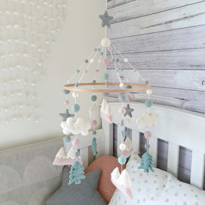 With beautiful hand stitched mountains and trees this captivating woodland crib mobile is a great feature piece for the nursery.