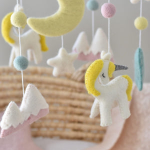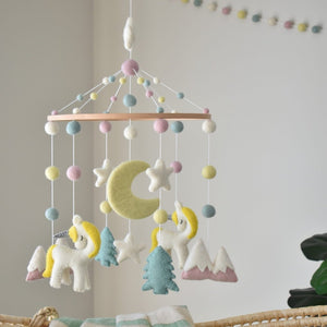 Pretty unicorn design with baby pink mountains, mint trees and a crescent moon at the centre.