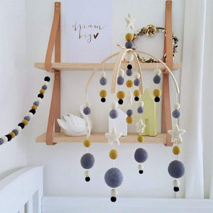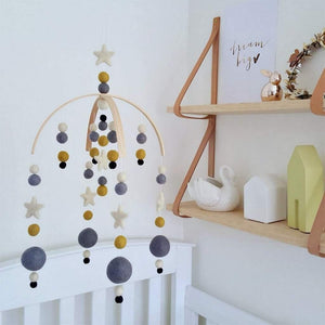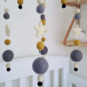 The Gold Dust felt baby mobile is a modern combination of cream, mustard, mid grey and black felt balls with cream stars to catch baby's eye.