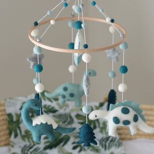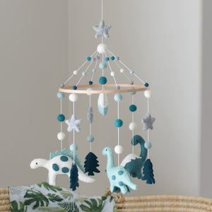 Fun dinosaur baby mobile in shades of green, grey and white.