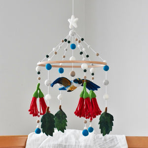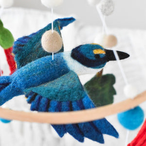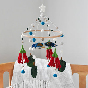 Let the charming Kōtare (Kingfisher) gracefully flit amongst the pōhutukawa flowers in your nursery. Crafted to be admired from every angle, our Kōtare Baby Mobile features exquisite detailing and vibrant shades of green, blue, and mandarin.