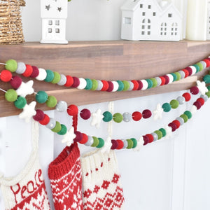 Our Merry and Bright felt garlands are made in beautiful shades of red, green and grey with white stars.