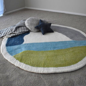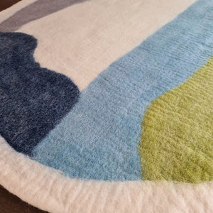 Our Land and Sky felt rug is inspired by nature and carefully crafted by hand. With colours of spring green, flowing blues, white and grey this rug will bring your room to life.