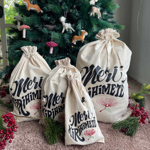 Made from a sturdy cotton and printed by hand, these heirloom quality Christmas Bags are made to last and look wonderful under the Christmas tree!